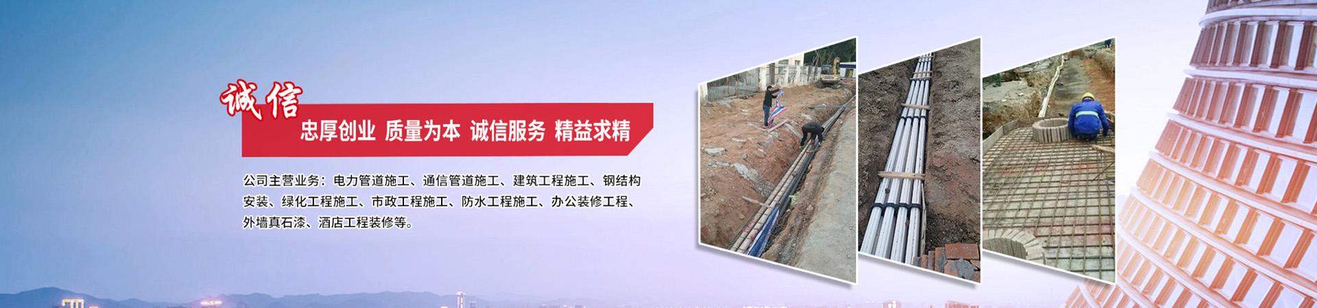 公司主營業(yè)務:電力管道施工、通信管道施工、建筑工程施工、鋼結(jié)構(gòu)安裝、綠化工程施工、市政工程施工、防水工程施工、辦公裝修工程、外墻真石漆、酒店工程裝修等。